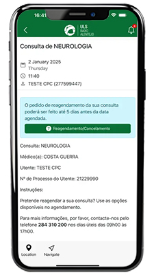 - Visualização detalhada dos agendamentos. Quaisquer alterações realizadas pela Unidade Local de Saúde do Baixo Alentejo serão replicadas na agenda do MyULSBA;