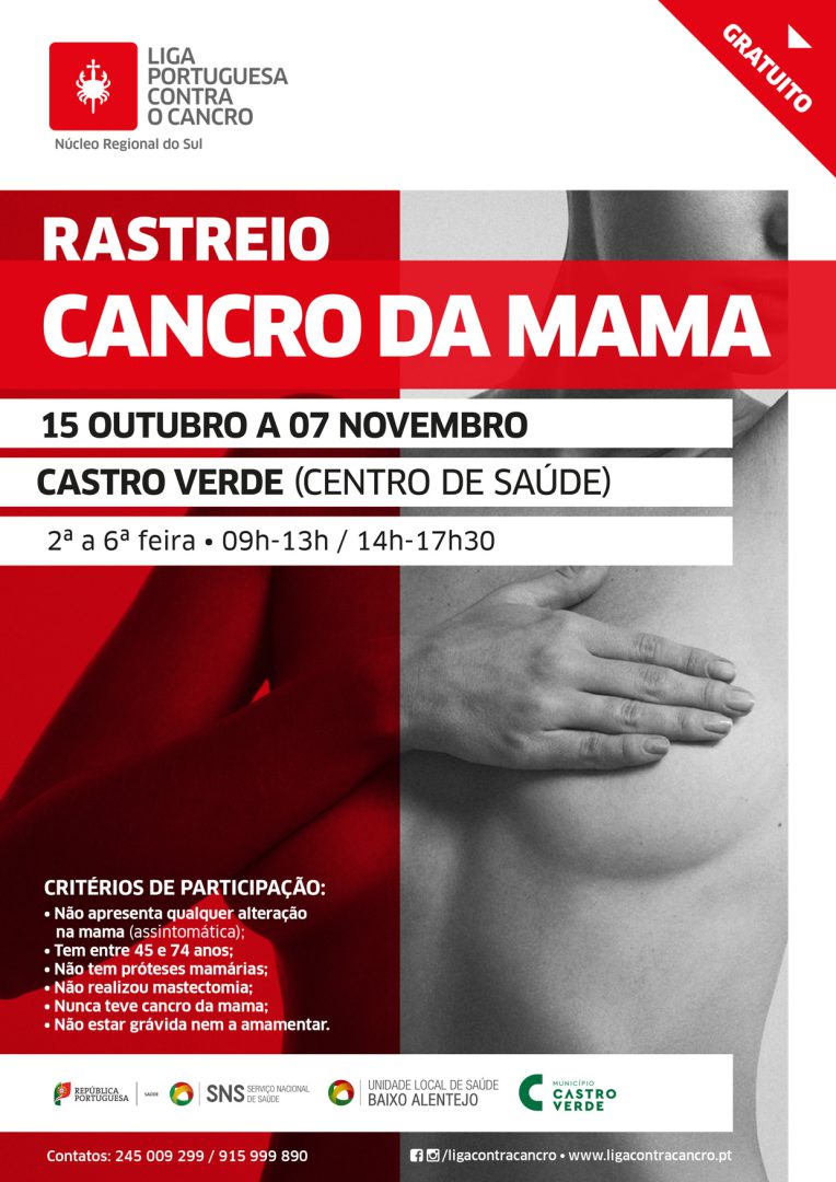 A Liga Portuguesa Contra o Cancro – Núcleo Regional do Sul (LPCC-NRS), em parceria com o Serviço Nacional de Saúde (SNS) anuncia a continuidade do Rastreio do Cancro de Mama, no Município de Castro Verde.